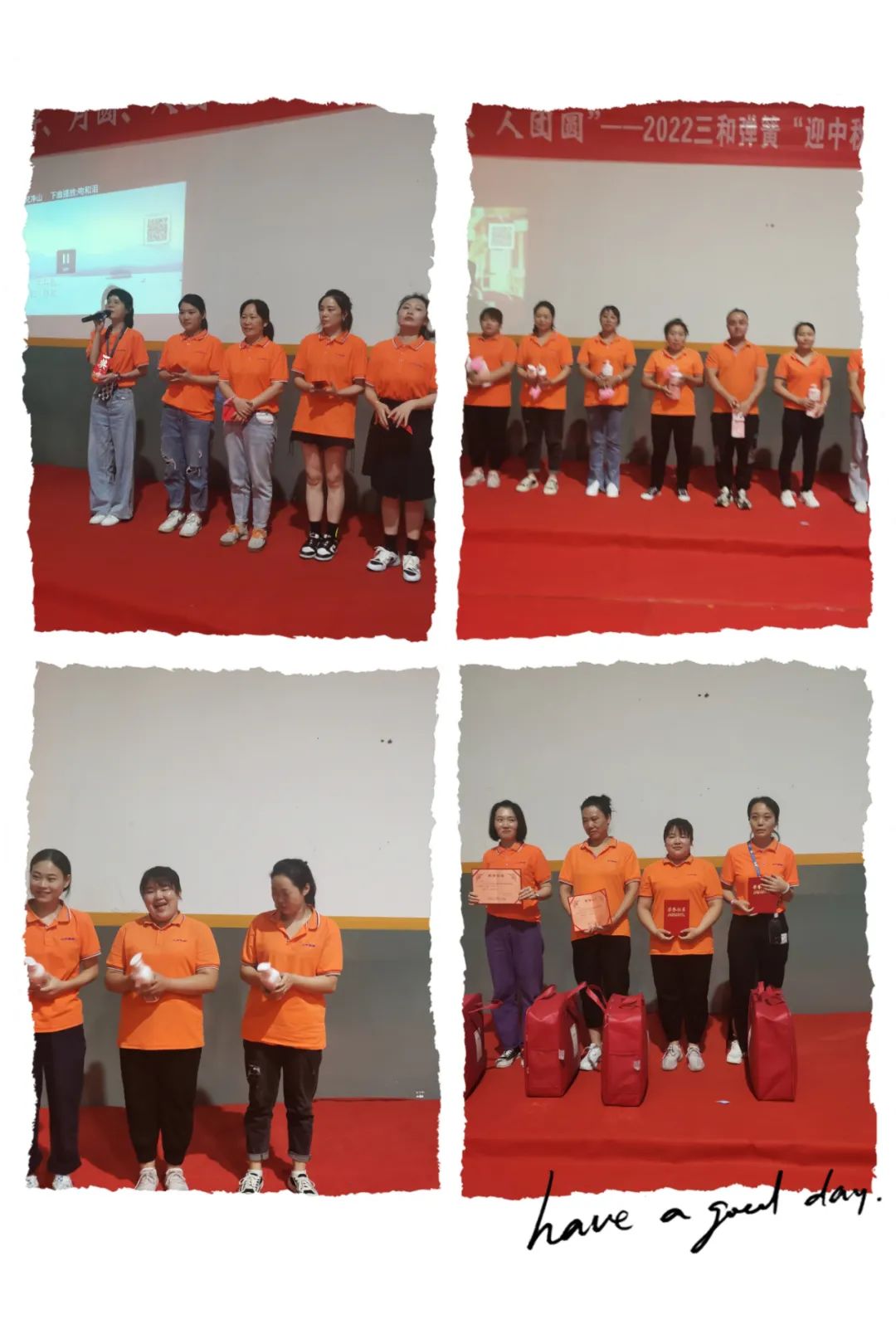 晚上七點,中秋晚會在三和麥霸的歌聲中拉開了序幕,下午比賽的名次,八月工分的績效獎金,在節目的穿插中,一一展現。美妙的歌聲,豐富的獎品,拿到獎金時的喜悅,讓現場氣氛熱烈,掌聲雷動。在頒發特等獎時,一首《千千闕歌》讓氣氛達到了高潮,之后更多的伙伴們展示了他們的才藝,最后在大家的依依不舍中所有的伙伴們一起高唱《明天會更好》結束了我們的晚會!